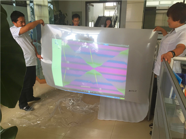 盡管沒有專門的調(diào)試場所,公司員工在集團二樓的過道、走廊架起了投影機,拉起了調(diào)光膜,對其進行一遍又一遍的調(diào)試。因為調(diào)光膜是新型產(chǎn)品,所以在沒有實驗以前不知道會有什么樣的效果,這就需要工作人員對其進行反復(fù)的實驗,確保投影畫面達到最清晰的效果,給客戶一個滿意的答復(fù)。
