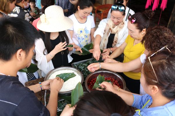 6月18日下午15時,包粽子比賽在景區(qū)中心街開賽。游客爭相參與,捋粽葉、疊形狀、填米棗扎、包口。頓時,三角形、牛角形、多邊形等別具式樣的粽子很快成型。