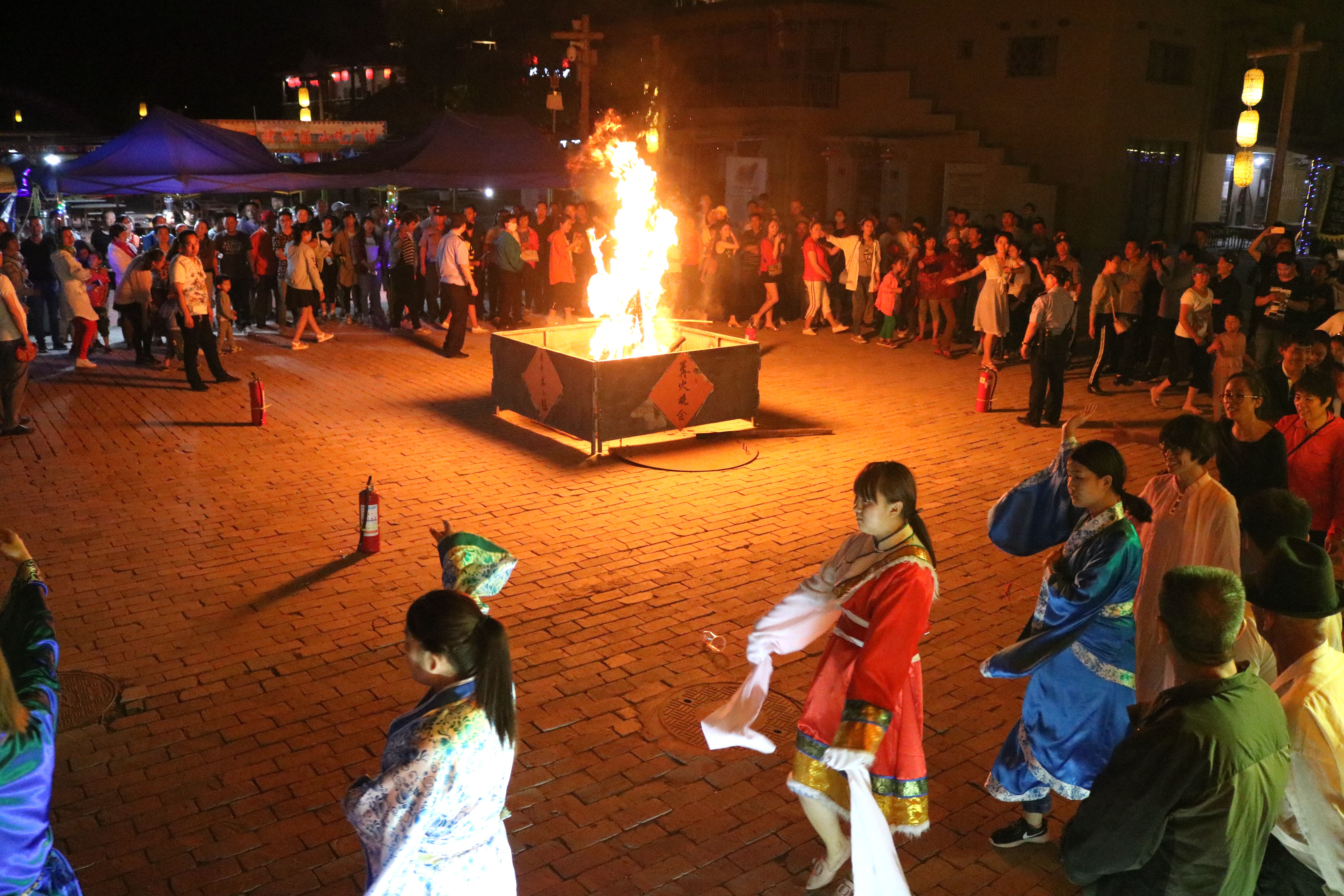 當(dāng)天晚上,月牙泉小鎮(zhèn)舉辦了篝火晚會。舞臺上輪番的精彩表演,讓游客們體驗了民俗的真情。入夜時分,盡管天空下著毛毛細(xì)雨,但是絲毫不阻礙人們的歡快之情。篝火熊熊,火光沖天,歡樂的人們手挽著手,一邊伴隨著音樂韻律盡情舞動,一邊拍手擊節(jié)低唱淺吟,沉浸在無比歡樂之中。