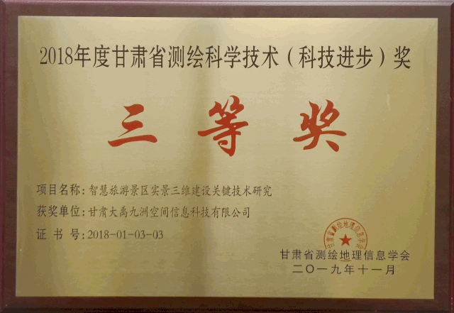 會上,甘肅省測繪地理信息學(xué)會理事長王有弢宣讀了甘肅省測繪地理信息學(xué)會“2018年度科學(xué)技術(shù)獎(jiǎng)”獎(jiǎng)勵(lì)的決定。由大禹九洲參評的“智慧旅游景區(qū)實(shí)景三維建設(shè)關(guān)鍵技術(shù)研究”項(xiàng)目榮獲2018年度甘肅省測繪科學(xué)技術(shù)(科技進(jìn)步)三等獎(jiǎng),“S28平?jīng)鍪徐`臺至華亭高速公路基礎(chǔ)控制測量與航測成圖測繪工程”項(xiàng)目榮獲2018年度甘肅省測繪科學(xué)技術(shù)(優(yōu)秀工程)金獎(jiǎng),“合水縣國土資源局不動(dòng)產(chǎn)登記平臺建設(shè)及數(shù)據(jù)整合采購項(xiàng)目”榮獲2018年度甘肅省測繪科學(xué)技術(shù)(優(yōu)秀工程)銅獎(jiǎng)。